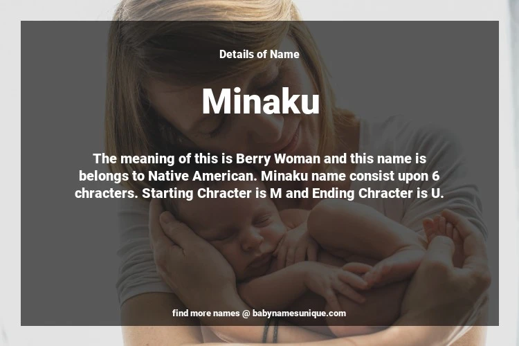 The name Minaku is chosen by those who are willing to find Unique Transgenders Baby Names. The meaning of this is Berry Woman and this name is belongs to Native American Origin. Baby Name Minaku consist upon 6 chracters. Starting alphabet is M and ending alphabet is U. This name is used primarily by parents who are considering unique baby names for Transgenders. The Zodiac Sign suitbale for this name are;
