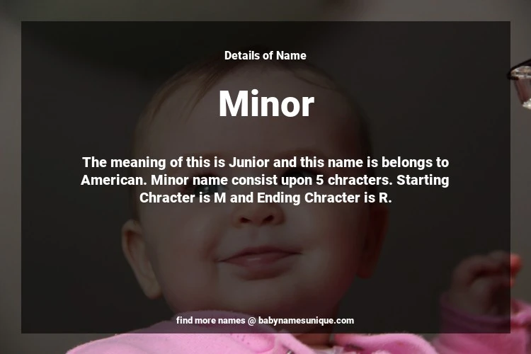 The name Minor is chosen by those who are willing to find Unique Transgenders Baby Names. The meaning of this is Junior and this name is belongs to American Origin. Baby Name Minor consist upon 5 chracters. Starting alphabet is M and ending alphabet is R. This name is used primarily by parents who are considering unique baby names for Transgenders. The Zodiac Sign suitbale for this name are;