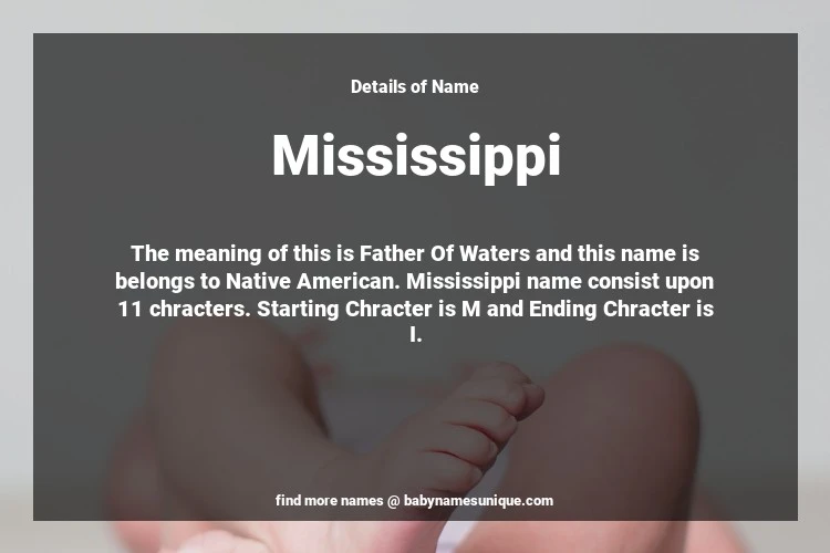 The name Mississippi is chosen by those who are willing to find Unique Transgenders Baby Names. The meaning of this is Father Of Waters and this name is belongs to Native American Origin. Baby Name Mississippi consist upon 11 chracters. Starting alphabet is M and ending alphabet is I. This name is used primarily by parents who are considering unique baby names for Transgenders. The Zodiac Sign suitbale for this name are;