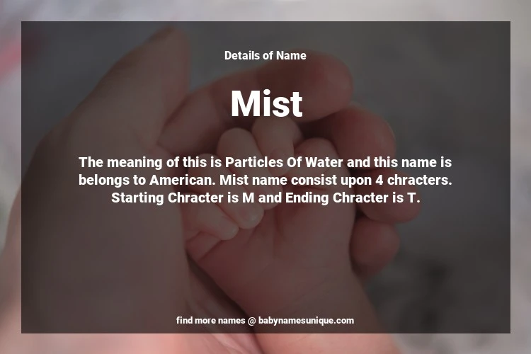 The name Mist is chosen by those who are willing to find Unique Transgenders Baby Names. The meaning of this is Particles Of Water and this name is belongs to American Origin. Baby Name Mist consist upon 4 chracters. Starting alphabet is M and ending alphabet is T. This name is used primarily by parents who are considering unique baby names for Transgenders. The Zodiac Sign suitbale for this name are;