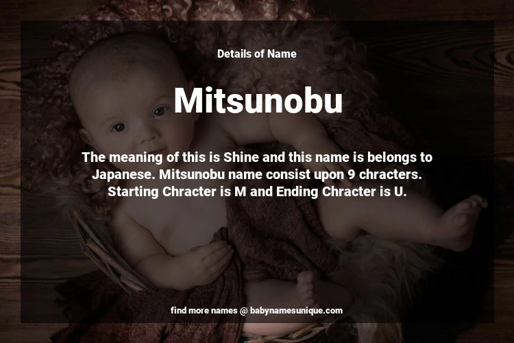 The name Mitsunobu is chosen by those who are willing to find Unique Boy Baby Names. The meaning of this is Shine and this name is belongs to Japanese Origin. Baby Name Mitsunobu consist upon 9 chracters. Starting alphabet is M and ending alphabet is U. This name is used primarily by parents who are considering unique baby names for Boy. The Zodiac Sign suitbale for this name are;