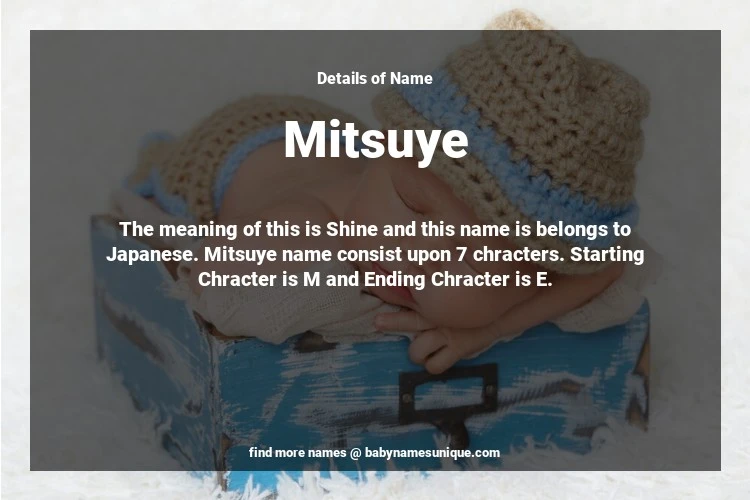 The name Mitsuye is chosen by those who are willing to find Unique Transgenders Baby Names. The meaning of this is Shine and this name is belongs to Japanese Origin. Baby Name Mitsuye consist upon 7 chracters. Starting alphabet is M and ending alphabet is E. This name is used primarily by parents who are considering unique baby names for Transgenders. The Zodiac Sign suitbale for this name are;