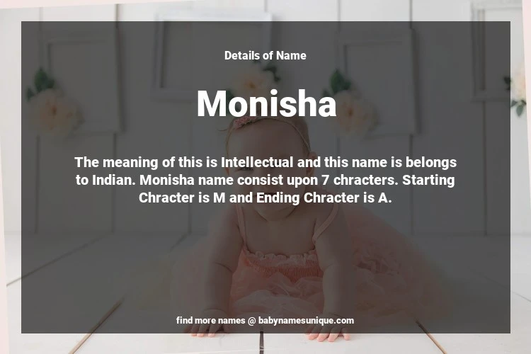 The name Monisha is chosen by those who are willing to find Unique Transgenders Baby Names. The meaning of this is Intellectual and this name is belongs to Indian Origin. Baby Name Monisha consist upon 7 chracters. Starting alphabet is M and ending alphabet is A. This name is used primarily by parents who are considering unique baby names for Transgenders. The Zodiac Sign suitbale for this name are;