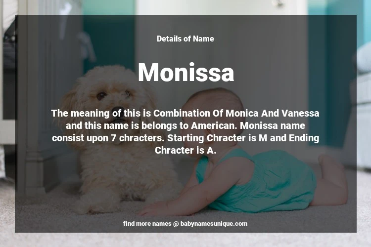 The name Monissa is chosen by those who are willing to find Unique Transgenders Baby Names. The meaning of this is Combination Of Monica And Vanessa and this name is belongs to American Origin. Baby Name Monissa consist upon 7 chracters. Starting alphabet is M and ending alphabet is A. This name is used primarily by parents who are considering unique baby names for Transgenders. The Zodiac Sign suitbale for this name are;