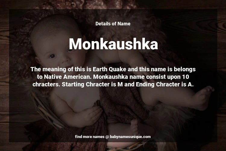 The name Monkaushka is chosen by those who are willing to find Unique Transgenders Baby Names. The meaning of this is Earth Quake and this name is belongs to Native American Origin. Baby Name Monkaushka consist upon 10 chracters. Starting alphabet is M and ending alphabet is A. This name is used primarily by parents who are considering unique baby names for Transgenders. The Zodiac Sign suitbale for this name are;