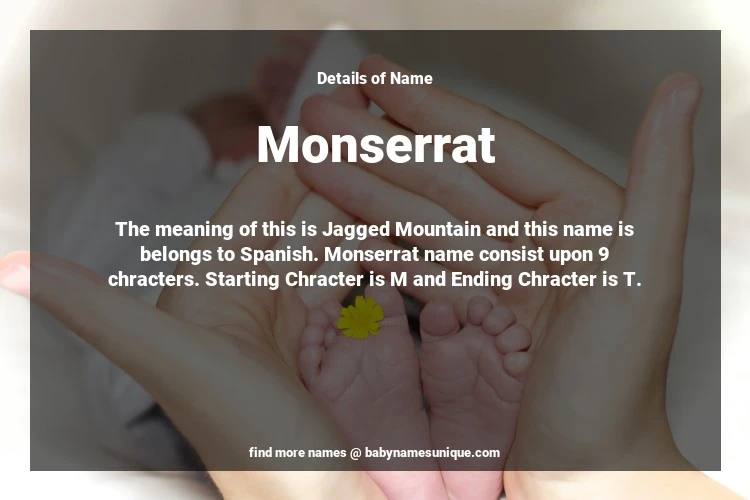 The name Monserrat is chosen by those who are willing to find Unique Transgenders Baby Names. The meaning of this is Jagged Mountain and this name is belongs to Spanish Origin. Baby Name Monserrat consist upon 9 chracters. Starting alphabet is M and ending alphabet is T. This name is used primarily by parents who are considering unique baby names for Transgenders. The Zodiac Sign suitbale for this name are;
