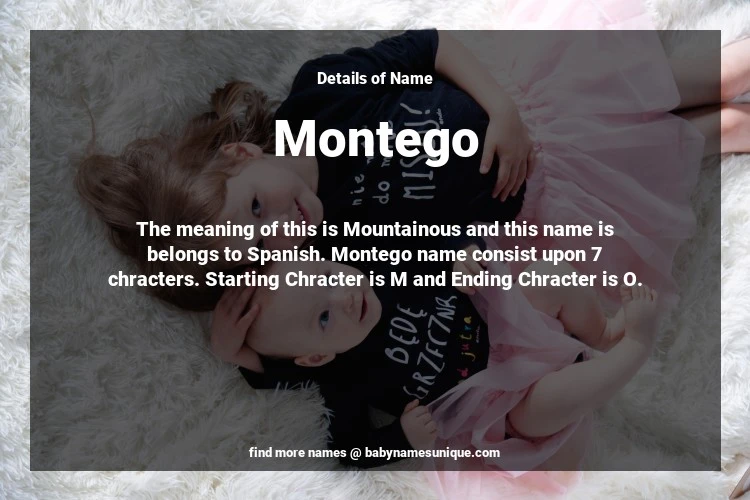 The name Montego is chosen by those who are willing to find Unique Boy Baby Names. The meaning of this is Mountainous and this name is belongs to Spanish Origin. Baby Name Montego consist upon 7 chracters. Starting alphabet is M and ending alphabet is O. This name is used primarily by parents who are considering unique baby names for Boy. The Zodiac Sign suitbale for this name are;