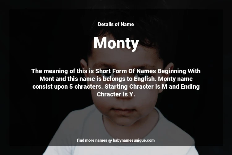 The name Monty is chosen by those who are willing to find Unique Boy Baby Names. The meaning of this is Short Form Of Names Beginning With Mont and this name is belongs to English Origin. Baby Name Monty consist upon 5 chracters. Starting alphabet is M and ending alphabet is Y. This name is used primarily by parents who are considering unique baby names for Boy. The Zodiac Sign suitbale for this name are;