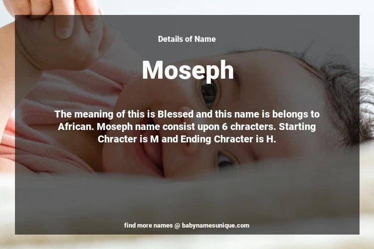 The name Moseph is chosen by those who are willing to find Unique Boy Baby Names. The meaning of this is Blessed and this name is belongs to African Origin. Baby Name Moseph consist upon 6 chracters. Starting alphabet is M and ending alphabet is H. This name is used primarily by parents who are considering unique baby names for Boy. The Zodiac Sign suitbale for this name are;