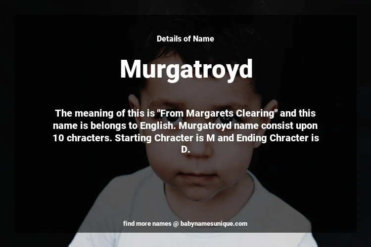 The name Murgatroyd is chosen by those who are willing to find Unique Transgenders Baby Names. The meaning of this is "From Margarets Clearing" and this name is belongs to English Origin. Baby Name Murgatroyd consist upon 10 chracters. Starting alphabet is M and ending alphabet is D. This name is used primarily by parents who are considering unique baby names for Transgenders. The Zodiac Sign suitbale for this name are;