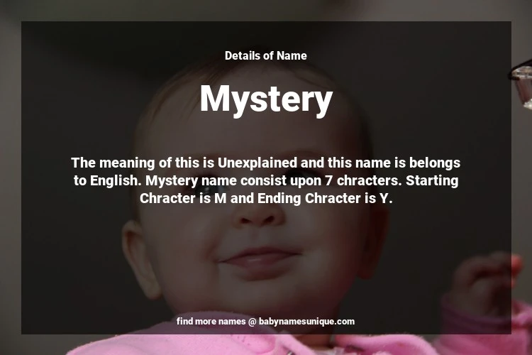 The name Mystery is chosen by those who are willing to find Unique Transgenders Baby Names. The meaning of this is Unexplained and this name is belongs to English Origin. Baby Name Mystery consist upon 7 chracters. Starting alphabet is M and ending alphabet is Y. This name is used primarily by parents who are considering unique baby names for Transgenders. The Zodiac Sign suitbale for this name are;