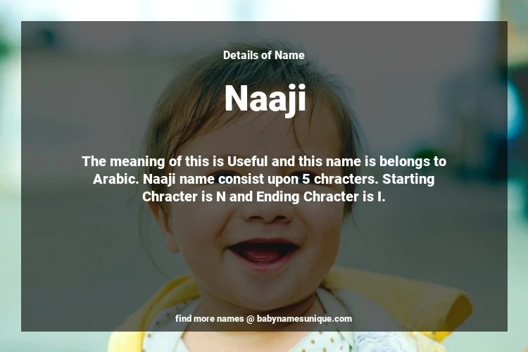 The name Naaji is chosen by those who are willing to find Unique Boy Baby Names. The meaning of this is Useful and this name is belongs to Arabic Origin. Baby Name Naaji consist upon 5 chracters. Starting alphabet is N and ending alphabet is I. This name is used primarily by parents who are considering unique baby names for Boy. The Zodiac Sign suitbale for this name are;