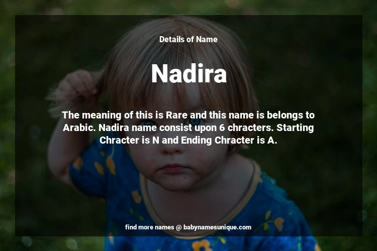The name Nadira is chosen by those who are willing to find Unique Transgenders Baby Names. The meaning of this is Rare and this name is belongs to Arabic Origin. Baby Name Nadira consist upon 6 chracters. Starting alphabet is N and ending alphabet is A. This name is used primarily by parents who are considering unique baby names for Transgenders. The Zodiac Sign suitbale for this name are;