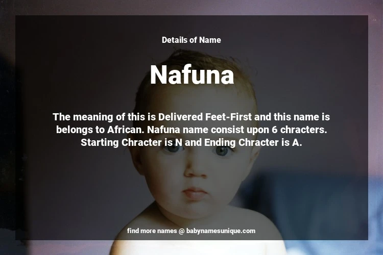 The name Nafuna is chosen by those who are willing to find Unique Transgenders Baby Names. The meaning of this is Delivered Feet-First and this name is belongs to African Origin. Baby Name Nafuna consist upon 6 chracters. Starting alphabet is N and ending alphabet is A. This name is used primarily by parents who are considering unique baby names for Transgenders. The Zodiac Sign suitbale for this name are;