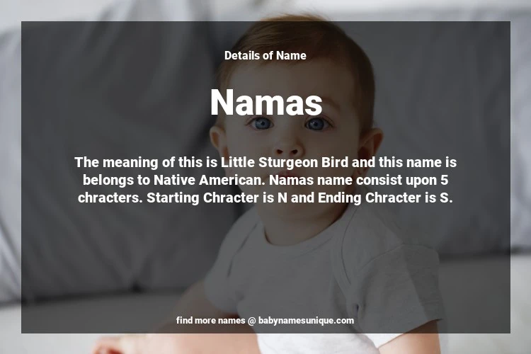 The name Namas is chosen by those who are willing to find Unique Transgenders Baby Names. The meaning of this is Little Sturgeon Bird and this name is belongs to Native American Origin. Baby Name Namas consist upon 5 chracters. Starting alphabet is N and ending alphabet is S. This name is used primarily by parents who are considering unique baby names for Transgenders. The Zodiac Sign suitbale for this name are;