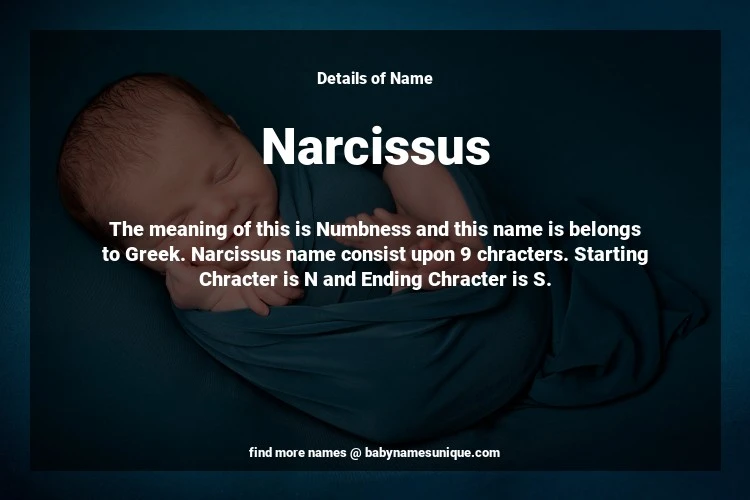 The name Narcissus is chosen by those who are willing to find Unique Transgenders Baby Names. The meaning of this is Numbness and this name is belongs to Greek Origin. Baby Name Narcissus consist upon 9 chracters. Starting alphabet is N and ending alphabet is S. This name is used primarily by parents who are considering unique baby names for Transgenders. The Zodiac Sign suitbale for this name are;