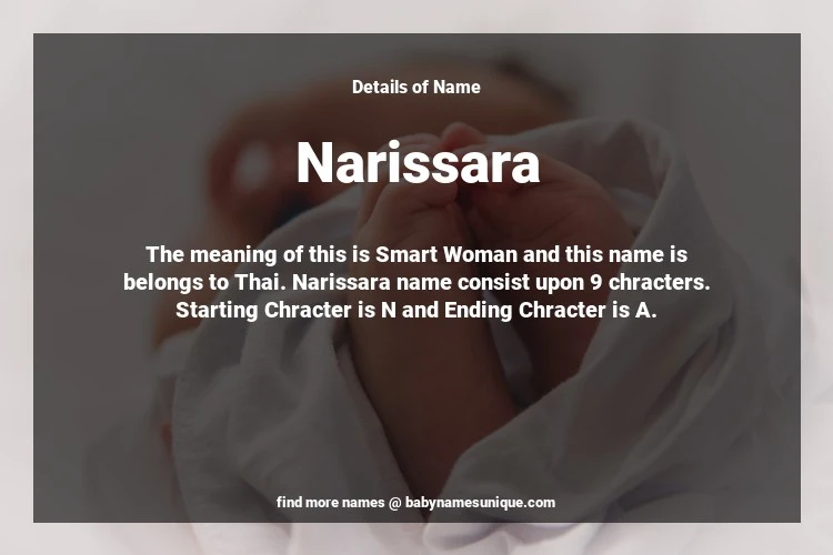 The name Narissara is chosen by those who are willing to find Unique Transgenders Baby Names. The meaning of this is Smart Woman and this name is belongs to Thai Origin. Baby Name Narissara consist upon 9 chracters. Starting alphabet is N and ending alphabet is A. This name is used primarily by parents who are considering unique baby names for Transgenders. The Zodiac Sign suitbale for this name are;