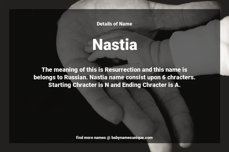 The name Nastia is chosen by those who are willing to find Unique Transgenders Baby Names. The meaning of this is Resurrection and this name is belongs to Russian Origin. Baby Name Nastia consist upon 6 chracters. Starting alphabet is N and ending alphabet is A. This name is used primarily by parents who are considering unique baby names for Transgenders. The Zodiac Sign suitbale for this name are;