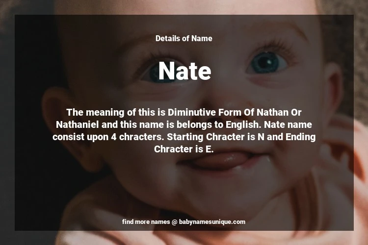 The name Nate is chosen by those who are willing to find Unique Boy Baby Names. The meaning of this is Diminutive Form Of Nathan Or Nathaniel and this name is belongs to English Origin. Baby Name Nate consist upon 4 chracters. Starting alphabet is N and ending alphabet is E. This name is used primarily by parents who are considering unique baby names for Boy. The Zodiac Sign suitbale for this name are;