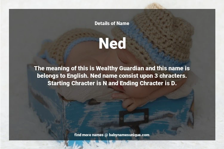 The name Ned is chosen by those who are willing to find Unique Boy Baby Names. The meaning of this is Wealthy Guardian and this name is belongs to English Origin. Baby Name Ned consist upon 3 chracters. Starting alphabet is N and ending alphabet is D. This name is used primarily by parents who are considering unique baby names for Boy. The Zodiac Sign suitbale for this name are;