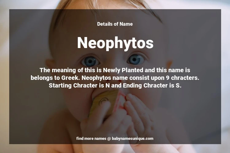 The name Neophytos is chosen by those who are willing to find Unique Boy Baby Names. The meaning of this is Newly Planted and this name is belongs to Greek Origin. Baby Name Neophytos consist upon 9 chracters. Starting alphabet is N and ending alphabet is S. This name is used primarily by parents who are considering unique baby names for Boy. The Zodiac Sign suitbale for this name are;