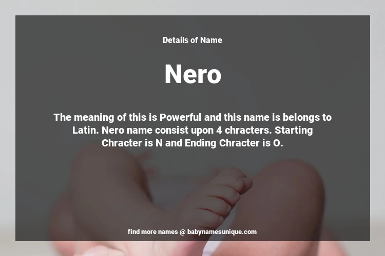 The name Nero is chosen by those who are willing to find Unique Boy Baby Names. The meaning of this is Powerful and this name is belongs to Latin Origin. Baby Name Nero consist upon 4 chracters. Starting alphabet is N and ending alphabet is O. This name is used primarily by parents who are considering unique baby names for Boy. The Zodiac Sign suitbale for this name are;