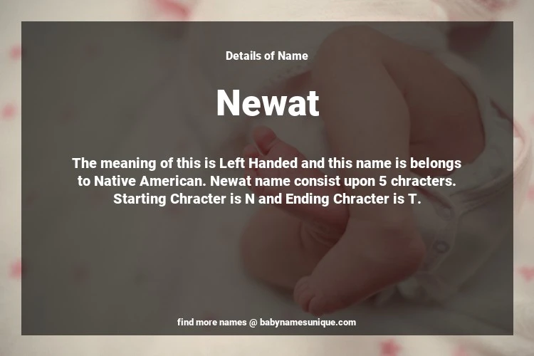 The name Newat is chosen by those who are willing to find Unique Transgenders Baby Names. The meaning of this is Left Handed and this name is belongs to Native American Origin. Baby Name Newat consist upon 5 chracters. Starting alphabet is N and ending alphabet is T. This name is used primarily by parents who are considering unique baby names for Transgenders. The Zodiac Sign suitbale for this name are;