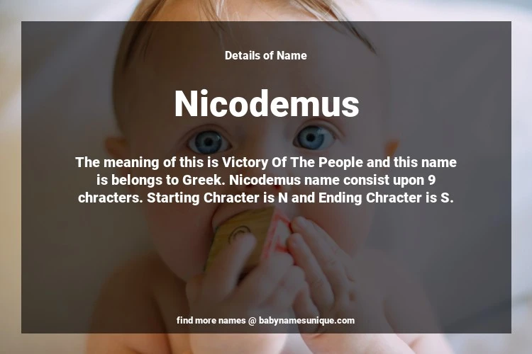 The name Nicodemus is chosen by those who are willing to find Unique Boy Baby Names. The meaning of this is Victory Of The People and this name is belongs to Greek Origin. Baby Name Nicodemus consist upon 9 chracters. Starting alphabet is N and ending alphabet is S. This name is used primarily by parents who are considering unique baby names for Boy. The Zodiac Sign suitbale for this name are;