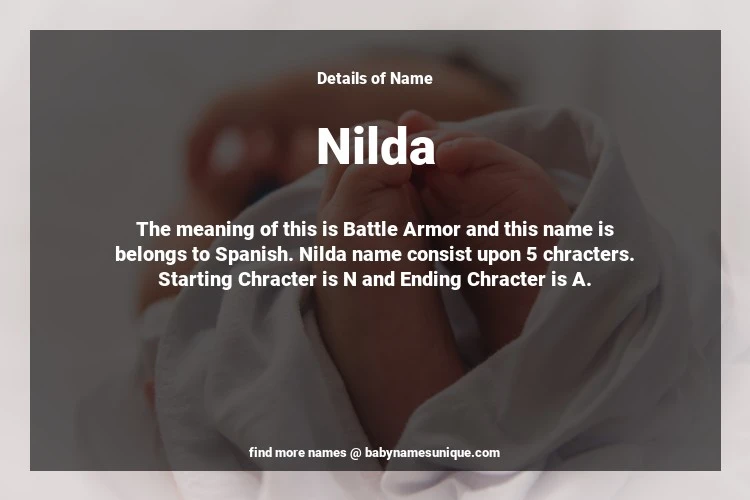 The name Nilda is chosen by those who are willing to find Unique Transgenders Baby Names. The meaning of this is Battle Armor and this name is belongs to Spanish Origin. Baby Name Nilda consist upon 5 chracters. Starting alphabet is N and ending alphabet is A. This name is used primarily by parents who are considering unique baby names for Transgenders. The Zodiac Sign suitbale for this name are;
