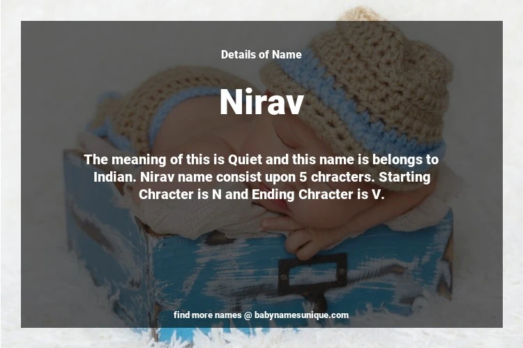 The name Nirav is chosen by those who are willing to find Unique Boy Baby Names. The meaning of this is Quiet and this name is belongs to Indian Origin. Baby Name Nirav consist upon 5 chracters. Starting alphabet is N and ending alphabet is V. This name is used primarily by parents who are considering unique baby names for Boy. The Zodiac Sign suitbale for this name are;