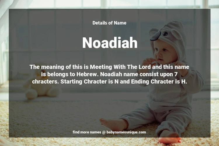 The name Noadiah is chosen by those who are willing to find Unique Transgenders Baby Names. The meaning of this is Meeting With The Lord and this name is belongs to Hebrew Origin. Baby Name Noadiah consist upon 7 chracters. Starting alphabet is N and ending alphabet is H. This name is used primarily by parents who are considering unique baby names for Transgenders. The Zodiac Sign suitbale for this name are;