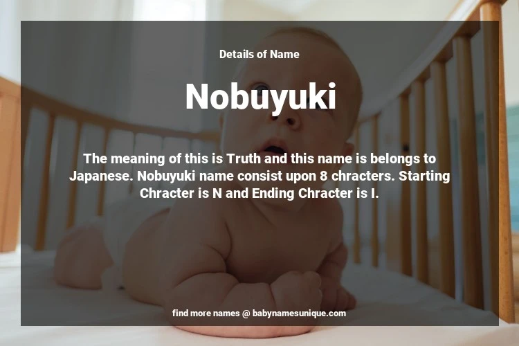 The name Nobuyuki is chosen by those who are willing to find Unique Boy Baby Names. The meaning of this is Truth and this name is belongs to Japanese Origin. Baby Name Nobuyuki consist upon 8 chracters. Starting alphabet is N and ending alphabet is I. This name is used primarily by parents who are considering unique baby names for Boy. The Zodiac Sign suitbale for this name are;