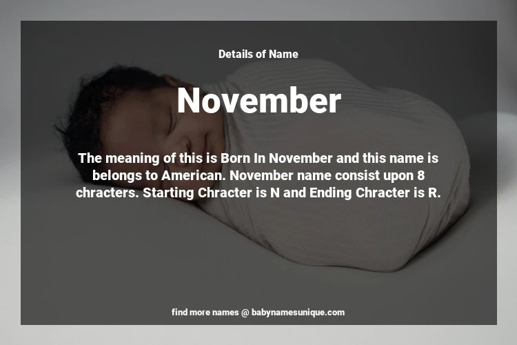The name November is chosen by those who are willing to find Unique Transgenders Baby Names. The meaning of this is Born In November and this name is belongs to American Origin. Baby Name November consist upon 8 chracters. Starting alphabet is N and ending alphabet is R. This name is used primarily by parents who are considering unique baby names for Transgenders. The Zodiac Sign suitbale for this name are;