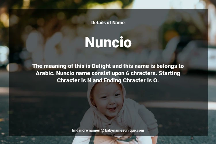 The name Nuncio is chosen by those who are willing to find Unique Transgenders Baby Names. The meaning of this is Delight and this name is belongs to Arabic Origin. Baby Name Nuncio consist upon 6 chracters. Starting alphabet is N and ending alphabet is O. This name is used primarily by parents who are considering unique baby names for Transgenders. The Zodiac Sign suitbale for this name are;