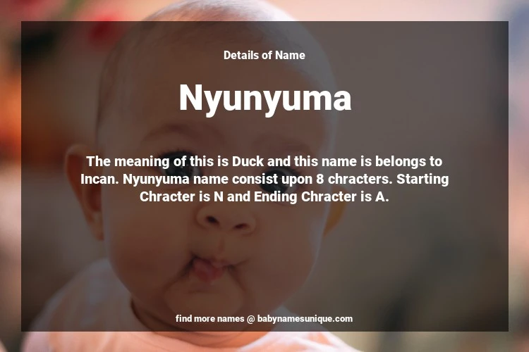 The name Nyunyuma is chosen by those who are willing to find Unique Transgenders Baby Names. The meaning of this is Duck and this name is belongs to Incan Origin. Baby Name Nyunyuma consist upon 8 chracters. Starting alphabet is N and ending alphabet is A. This name is used primarily by parents who are considering unique baby names for Transgenders. The Zodiac Sign suitbale for this name are;