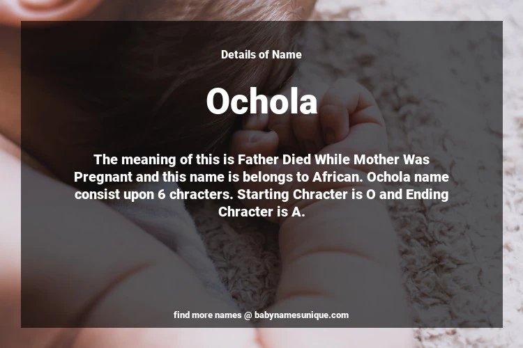The name Ochola is chosen by those who are willing to find Unique Boy Baby Names. The meaning of this is Father Died While Mother Was Pregnant and this name is belongs to African Origin. Baby Name Ochola consist upon 6 chracters. Starting alphabet is O and ending alphabet is A. This name is used primarily by parents who are considering unique baby names for Boy. The Zodiac Sign suitbale for this name are;