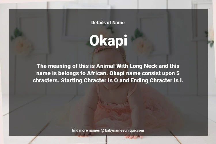 The name Okapi is chosen by those who are willing to find Unique Transgenders Baby Names. The meaning of this is Animal With Long Neck and this name is belongs to African Origin. Baby Name Okapi consist upon 5 chracters. Starting alphabet is O and ending alphabet is I. This name is used primarily by parents who are considering unique baby names for Transgenders. The Zodiac Sign suitbale for this name are;