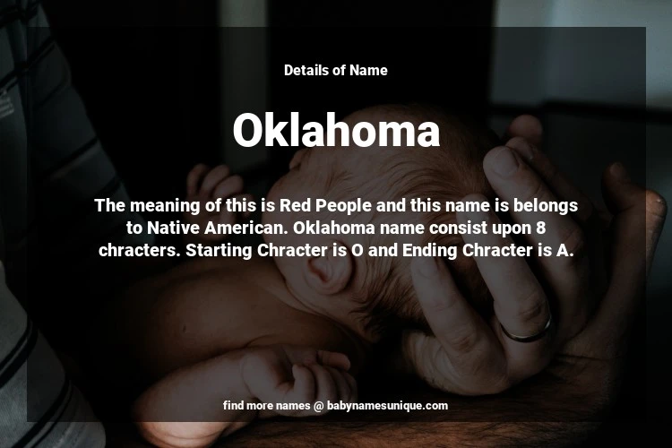 The name Oklahoma is chosen by those who are willing to find Unique Transgenders Baby Names. The meaning of this is Red People and this name is belongs to Native American Origin. Baby Name Oklahoma consist upon 8 chracters. Starting alphabet is O and ending alphabet is A. This name is used primarily by parents who are considering unique baby names for Transgenders. The Zodiac Sign suitbale for this name are;