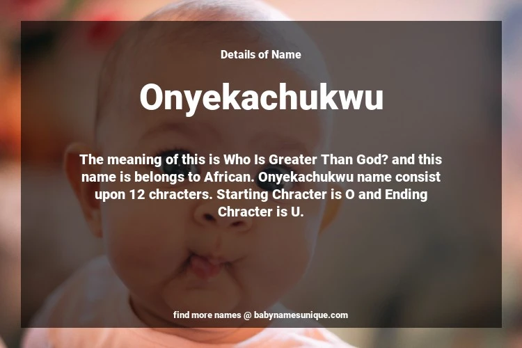 The name Onyekachukwu is chosen by those who are willing to find Unique Transgenders Baby Names. The meaning of this is Who Is Greater Than God? and this name is belongs to African Origin. Baby Name Onyekachukwu consist upon 12 chracters. Starting alphabet is O and ending alphabet is U. This name is used primarily by parents who are considering unique baby names for Transgenders. The Zodiac Sign suitbale for this name are;