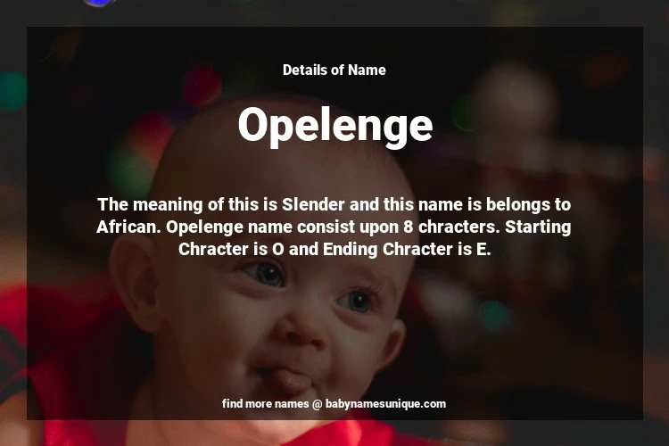 The name Opelenge is chosen by those who are willing to find Unique Transgenders Baby Names. The meaning of this is Slender and this name is belongs to African Origin. Baby Name Opelenge consist upon 8 chracters. Starting alphabet is O and ending alphabet is E. This name is used primarily by parents who are considering unique baby names for Transgenders. The Zodiac Sign suitbale for this name are;