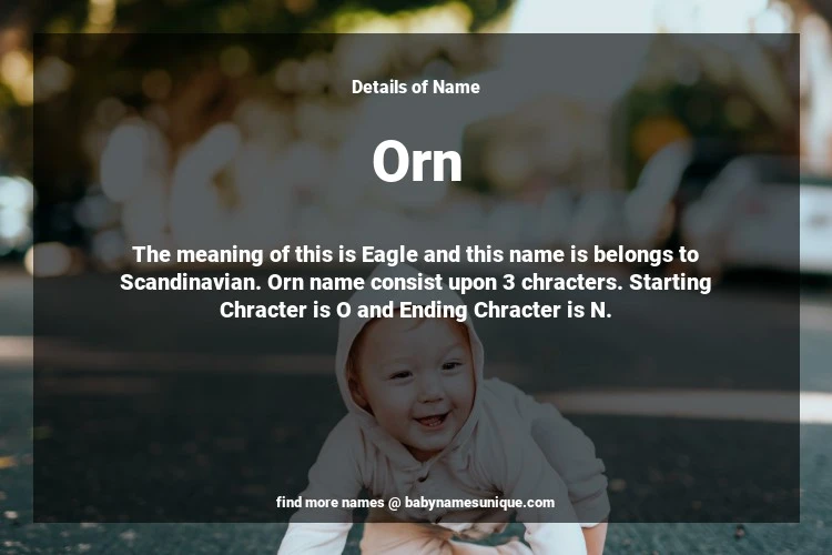 The name Orn is chosen by those who are willing to find Unique Boy Baby Names. The meaning of this is Eagle and this name is belongs to Scandinavian Origin. Baby Name Orn consist upon 3 chracters. Starting alphabet is O and ending alphabet is N. This name is used primarily by parents who are considering unique baby names for Boy. The Zodiac Sign suitbale for this name are;