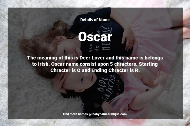 The name Oscar is chosen by those who are willing to find Unique Boy Baby Names. The meaning of this is Deer Lover and this name is belongs to Irish Origin. Baby Name Oscar consist upon 5 chracters. Starting alphabet is O and ending alphabet is R. This name is used primarily by parents who are considering unique baby names for Boy. The Zodiac Sign suitbale for this name are;