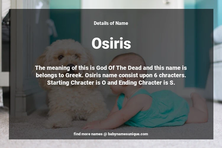 The name Osiris is chosen by those who are willing to find Unique Boy Baby Names. The meaning of this is God Of The Dead and this name is belongs to Greek Origin. Baby Name Osiris consist upon 6 chracters. Starting alphabet is O and ending alphabet is S. This name is used primarily by parents who are considering unique baby names for Boy. The Zodiac Sign suitbale for this name are;