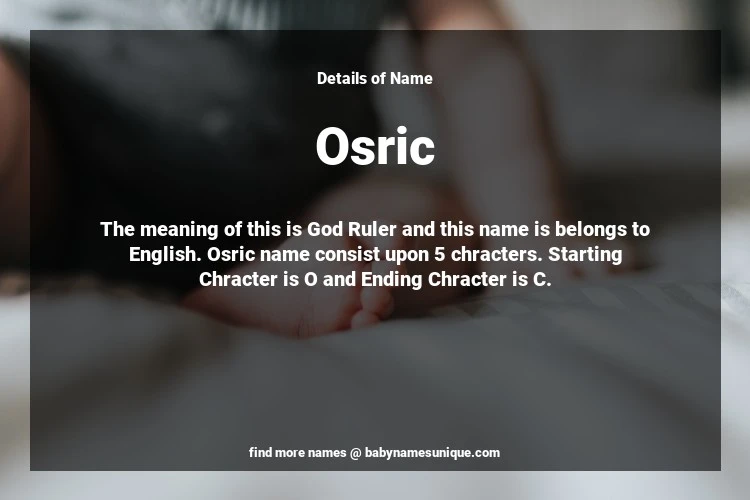 The name Osric is chosen by those who are willing to find Unique Boy Baby Names. The meaning of this is God Ruler and this name is belongs to English Origin. Baby Name Osric consist upon 5 chracters. Starting alphabet is O and ending alphabet is C. This name is used primarily by parents who are considering unique baby names for Boy. The Zodiac Sign suitbale for this name are;