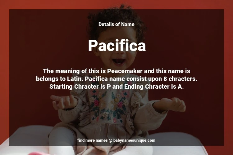 The name Pacifica is chosen by those who are willing to find Unique Transgenders Baby Names. The meaning of this is Peacemaker and this name is belongs to Latin Origin. Baby Name Pacifica consist upon 8 chracters. Starting alphabet is P and ending alphabet is A. This name is used primarily by parents who are considering unique baby names for Transgenders. The Zodiac Sign suitbale for this name are;