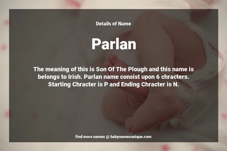 The name Parlan is chosen by those who are willing to find Unique Transgenders Baby Names. The meaning of this is Son Of The Plough and this name is belongs to Irish Origin. Baby Name Parlan consist upon 6 chracters. Starting alphabet is P and ending alphabet is N. This name is used primarily by parents who are considering unique baby names for Transgenders. The Zodiac Sign suitbale for this name are;