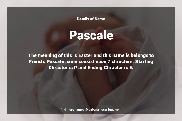The name Pascale is chosen by those who are willing to find Unique Transgenders Baby Names. The meaning of this is Easter and this name is belongs to French Origin. Baby Name Pascale consist upon 7 chracters. Starting alphabet is P and ending alphabet is E. This name is used primarily by parents who are considering unique baby names for Transgenders. The Zodiac Sign suitbale for this name are;