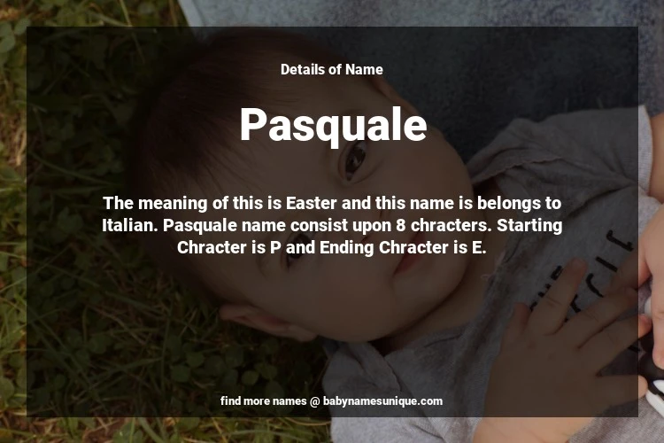 The name Pasquale is chosen by those who are willing to find Unique Boy Baby Names. The meaning of this is Easter and this name is belongs to Italian Origin. Baby Name Pasquale consist upon 8 chracters. Starting alphabet is P and ending alphabet is E. This name is used primarily by parents who are considering unique baby names for Boy. The Zodiac Sign suitbale for this name are;