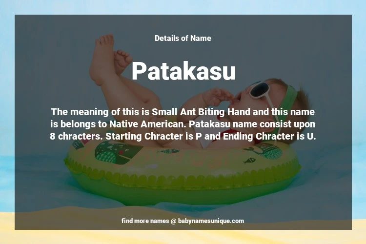The name Patakasu is chosen by those who are willing to find Unique Boy Baby Names. The meaning of this is Small Ant Biting Hand and this name is belongs to Native American Origin. Baby Name Patakasu consist upon 8 chracters. Starting alphabet is P and ending alphabet is U. This name is used primarily by parents who are considering unique baby names for Boy. The Zodiac Sign suitbale for this name are;
