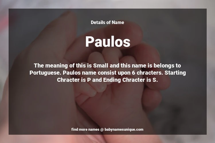 The name Paulos is chosen by those who are willing to find Unique Boy Baby Names. The meaning of this is Small and this name is belongs to Portuguese Origin. Baby Name Paulos consist upon 6 chracters. Starting alphabet is P and ending alphabet is S. This name is used primarily by parents who are considering unique baby names for Boy. The Zodiac Sign suitbale for this name are;